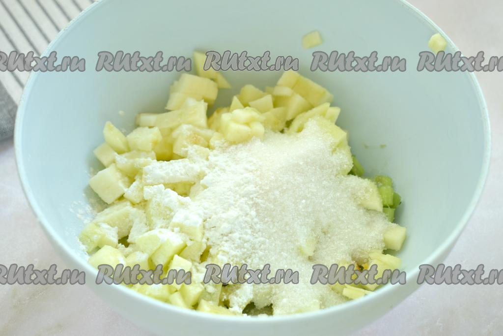 К ревеню и яблокам всыпаем сахар и крахмал, перемешиваем и начинка для дрожжевого пирога готова.