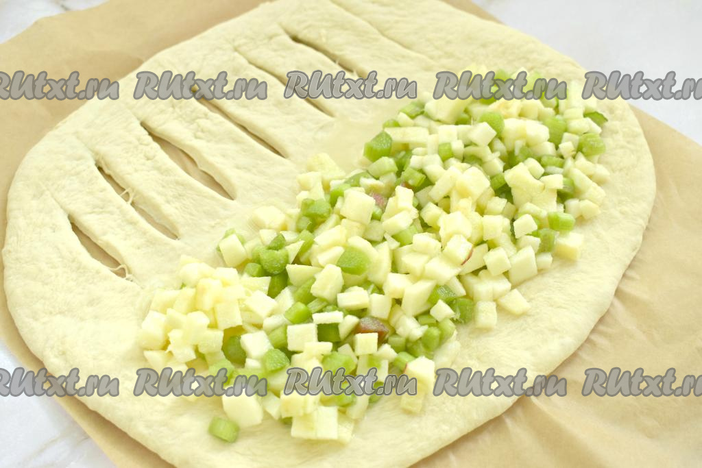 На сторону пласта теста без надрезов выкладываем начинку из ревеня и яблок, оставляя свободными по 2 сантиметра от каждого края.