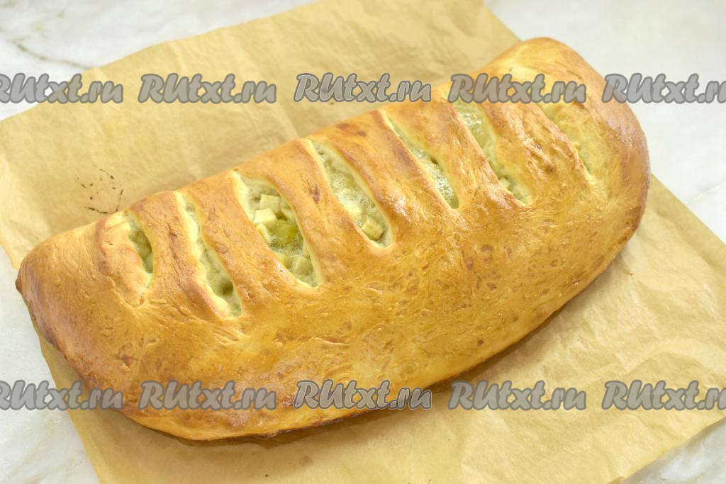Начинку накрываем стороной с надрезами, хорошо скрепляем края пирога с 3 сторон. Поверхности пирога смазываем взбитым яйцом (или молоком).