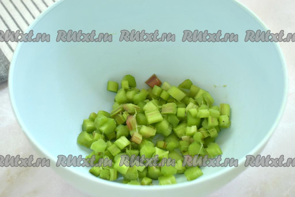 Моем стебли ревеня. Снимаем со стеблей ревеня тонкую плёнку. Очищенные стебли нарезаем на небольшие части и перекладываем в миску.