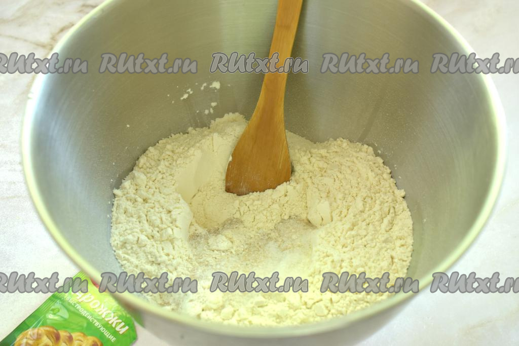 Прежде всего замесим дрожжевое тесто, для этого в достаточно объёмную миску просеиваем муку, всыпаем сухие дрожжи, сахар и соль, хорошо перемешиваем, образуя в центре получившейся смеси углубление.