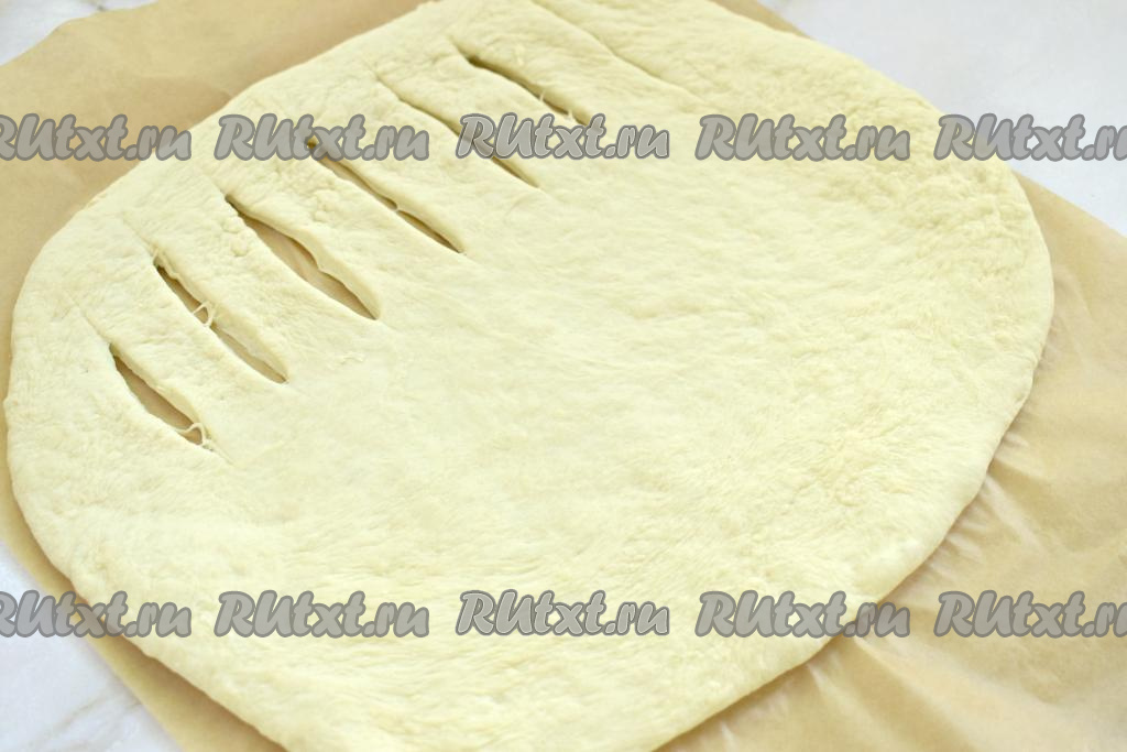 Поднявшееся дрожжевое тесто обминаем руками. На столе, присыпанном мукой, раскатываем дрожжевое тесто в прямоугольный пласт толщиной примерно 7-9 миллиметра. С одной стороны пласта делаем надрезы ножом, оставляя края нетронутыми, как на фото.