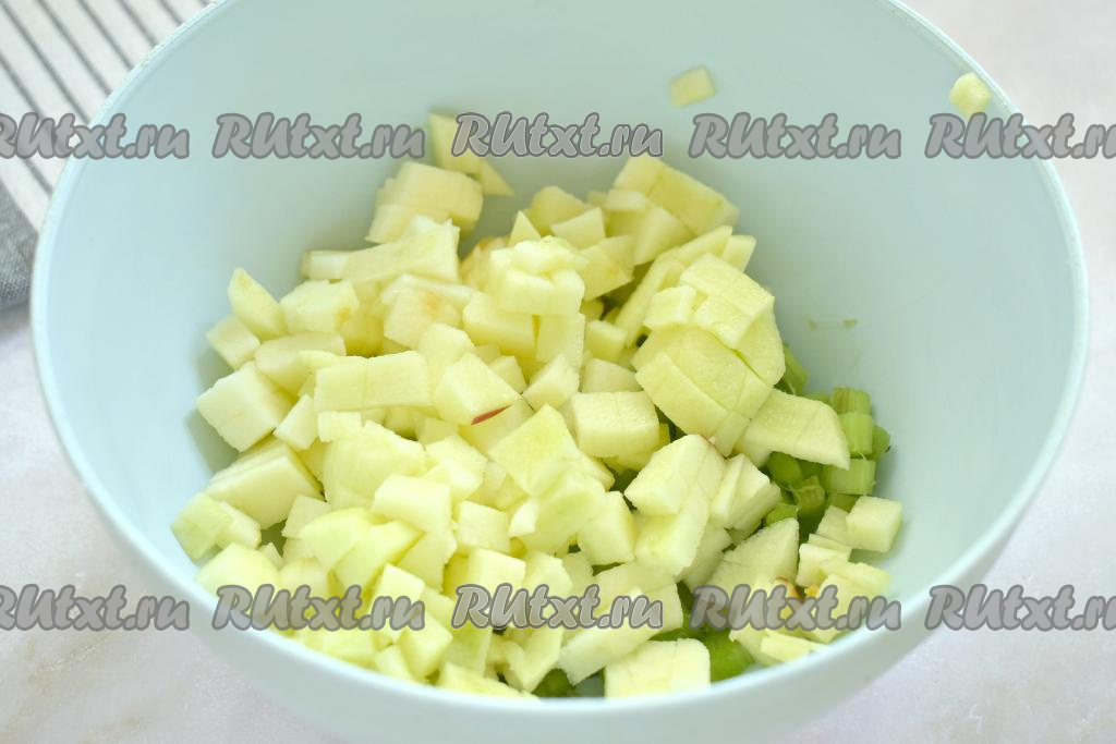 Очищаем от кожуры и семян яблоки, нарезаем их на небольшие кубики, добавляем к ревеню.