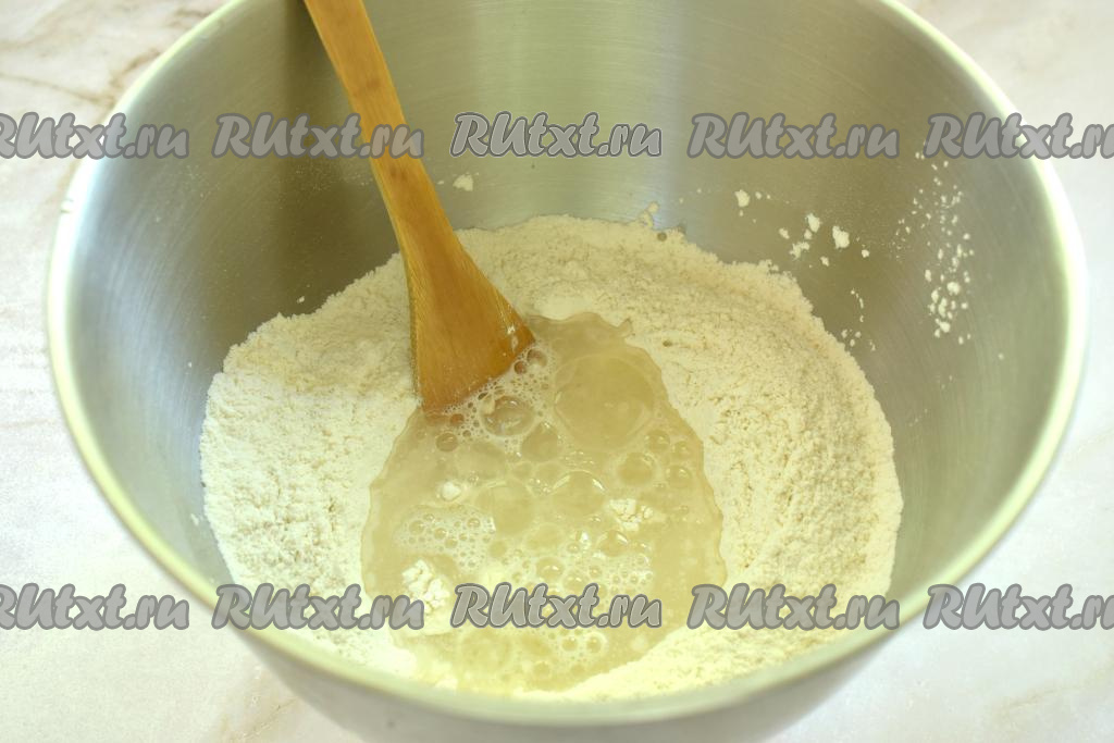В углубление в мучной смеси вливаем тёплую воду (температура воды примерно 38-39 градусов) и растительное масло, перемешиваем лопаткой.
