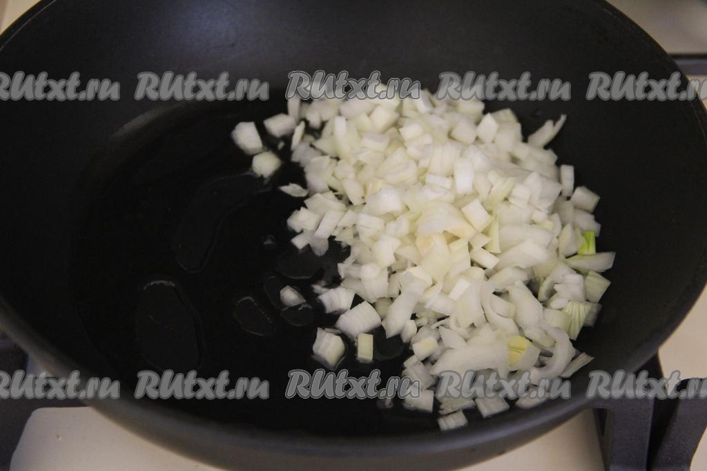 Отставить вермишель в сторону. В другой сковороде разогреть растительное масло, выложить мелко нарезанный лук и обжаривать его на среднем огне, время от времени помешивая, до мягкости (обычно лук становится мягким в течение 3-4 минут).