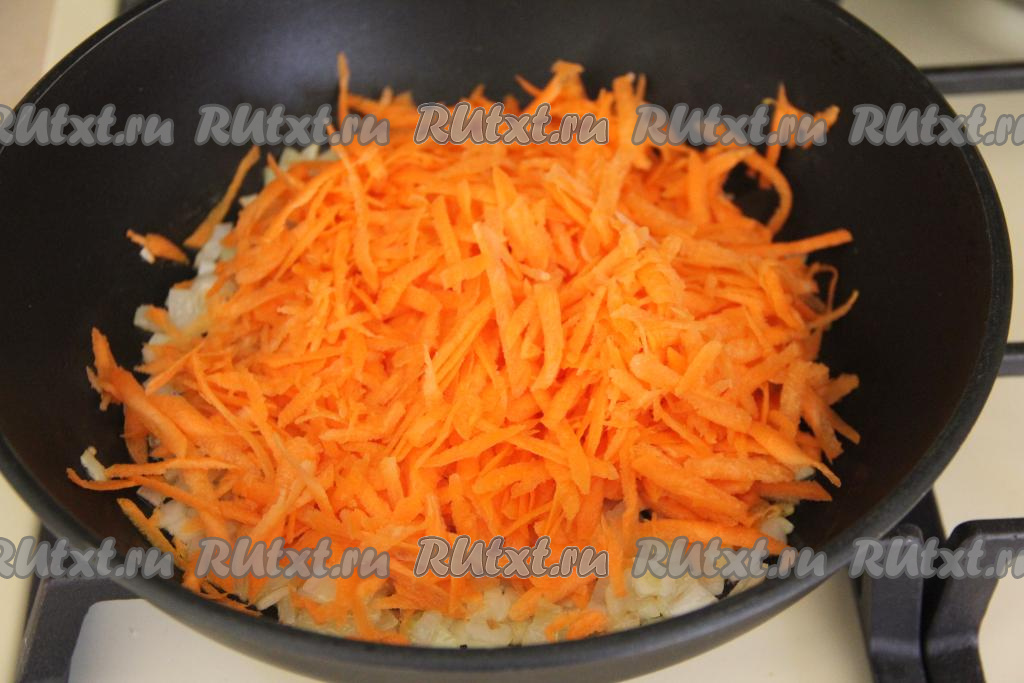 К обжаренному луку добавить морковку, натёртую на крупной тёрке, перемешать и обжаривать минут 5 (до мягкости моркови), периодически перемешивая.