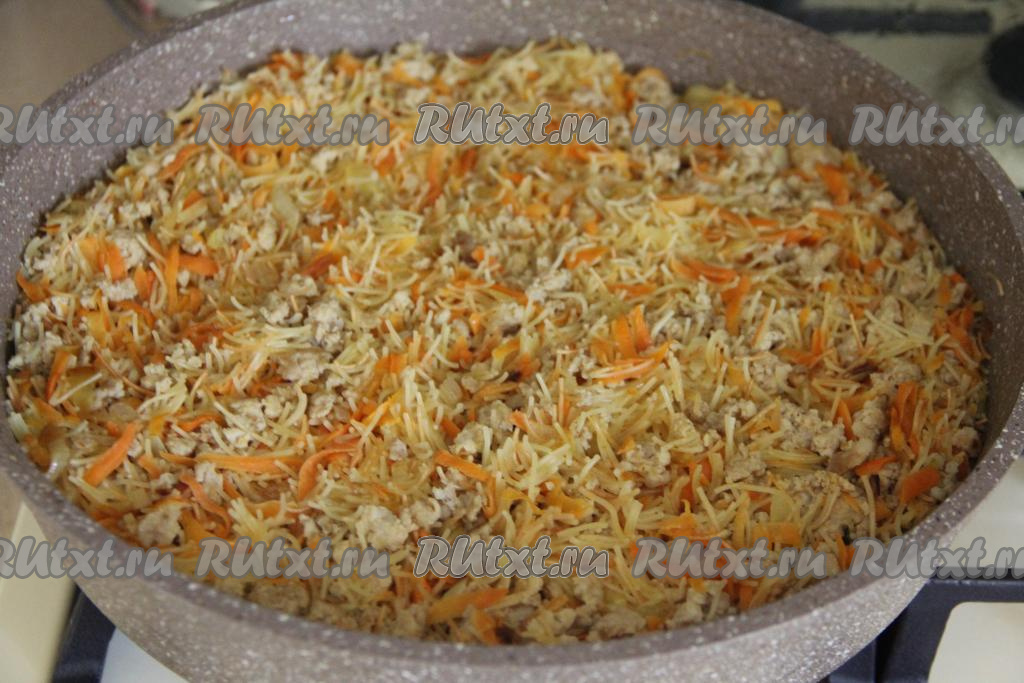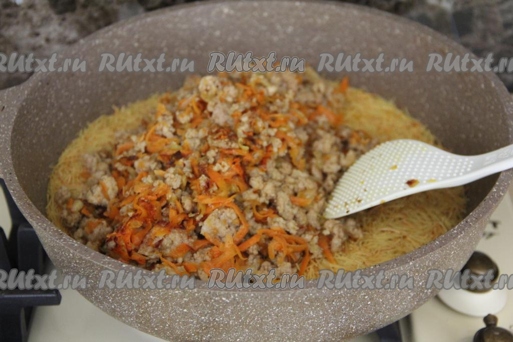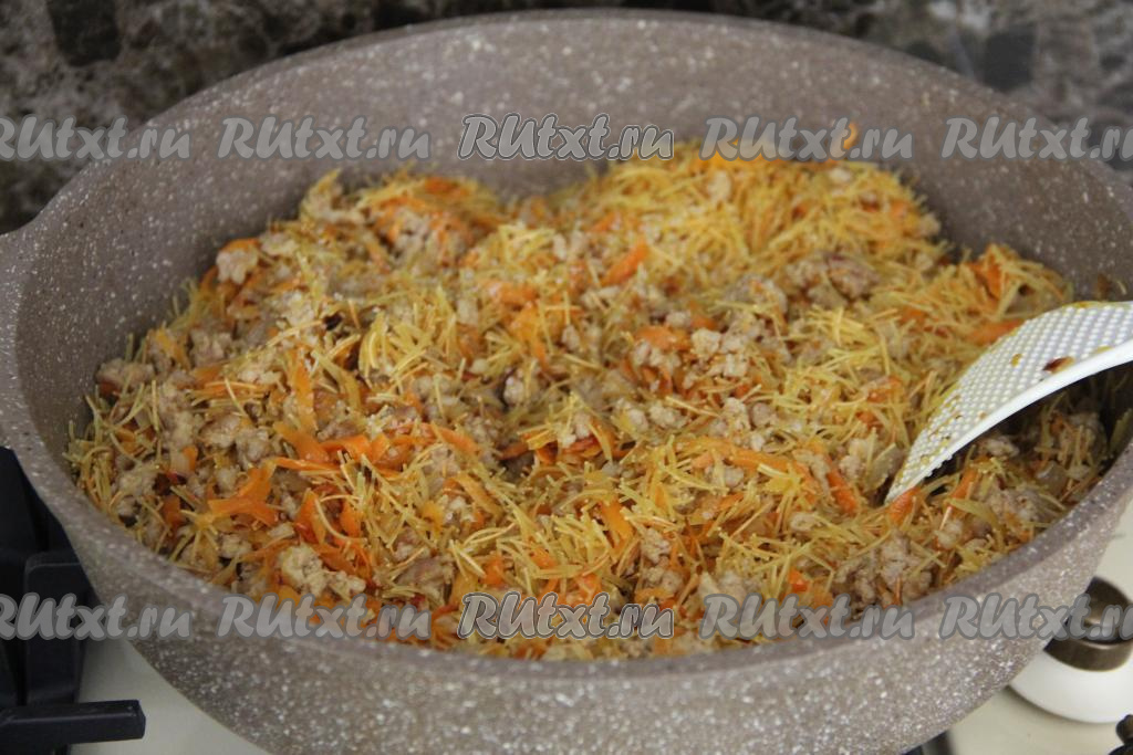 Затем фарш вместе с овощами переложить на сковороду к обжаренной вермишели.
