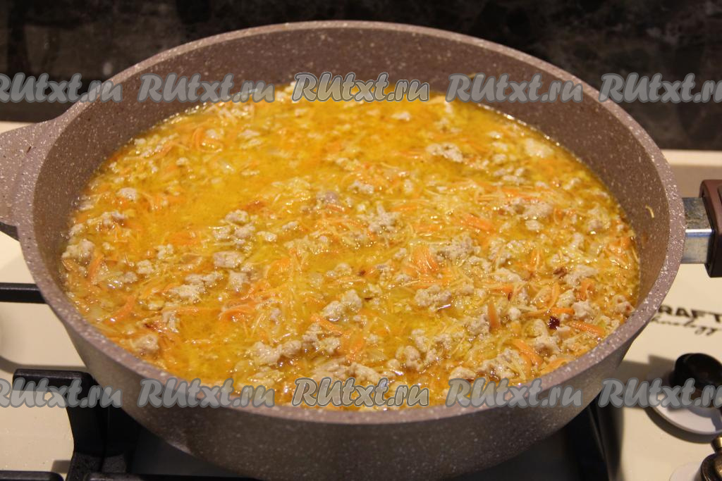 Как только вода закипит, убавить огонь до минимума и накрыть сковороду крышкой. Готовить вермишель с фаршем минут 15 (до полного испарения жидкости).