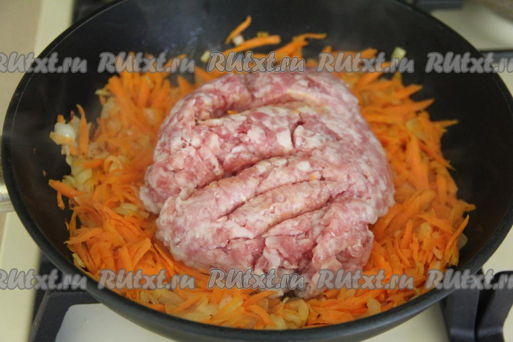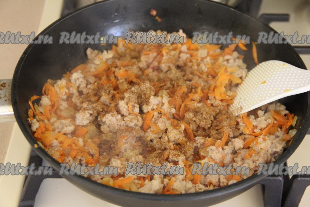 Постоянно разбивая комочки мяса, жарить фарш с овощами минут 15. Посолить по вкусу, можно добавить любимые специи для мяса.