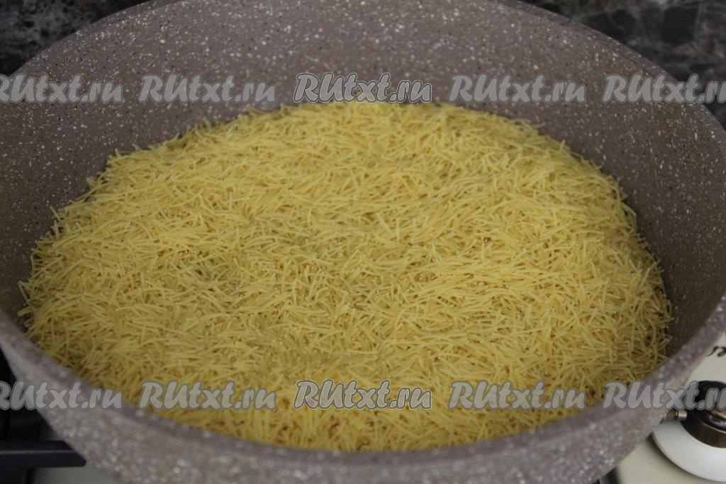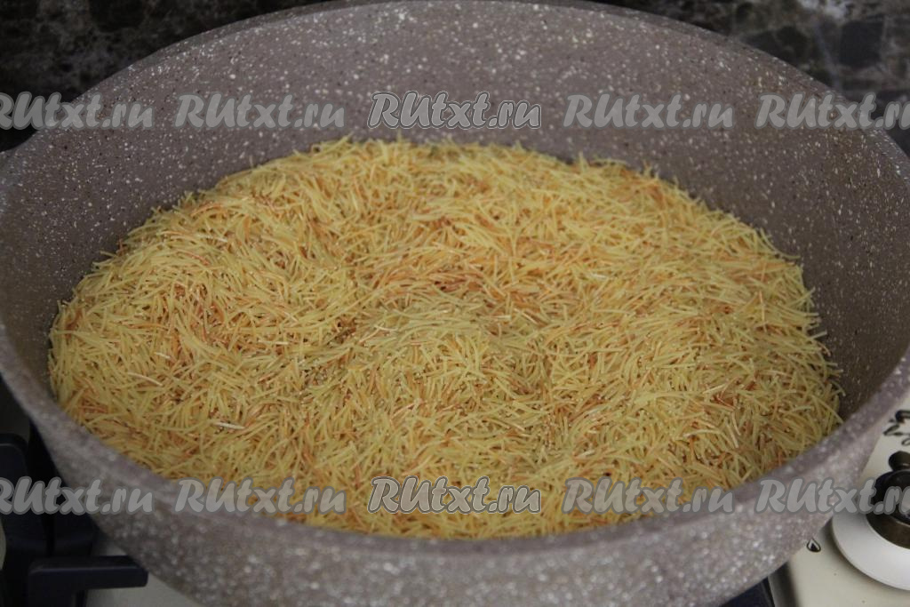 Жарить вермишель на среднем огне, периодически перемешивая, до золотистого цвета. На обжаривание понадобится буквально несколько минут, следите, чтобы вермишель не подгорела. Благодаря обжариванию, вермишель не будет слипаться во время дальнейшей варки.