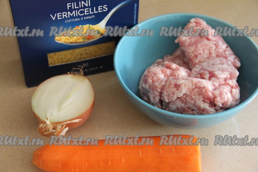 Влить горячую воду, добавить соль по вкусу, перемешать вермишель с фаршем, морковкой и луком.