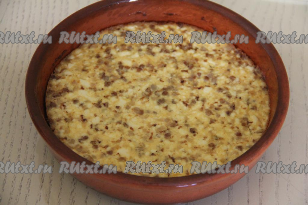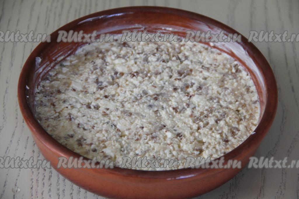 Форму для запекания (я взяла керамическую форму диаметром 20 сантиметров) смазать сливочным маслом, затем выложить творожно-гречневую массу.