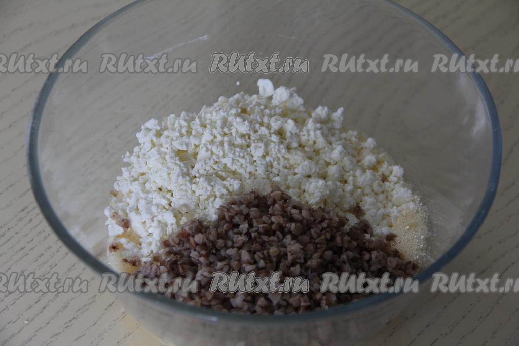 В миску с получившейся яичной смесью добавить творог и остывшую варёную гречку, перемешать творожно-гречневую массу лопаткой (или столовой ложкой). Масса получится негустой.