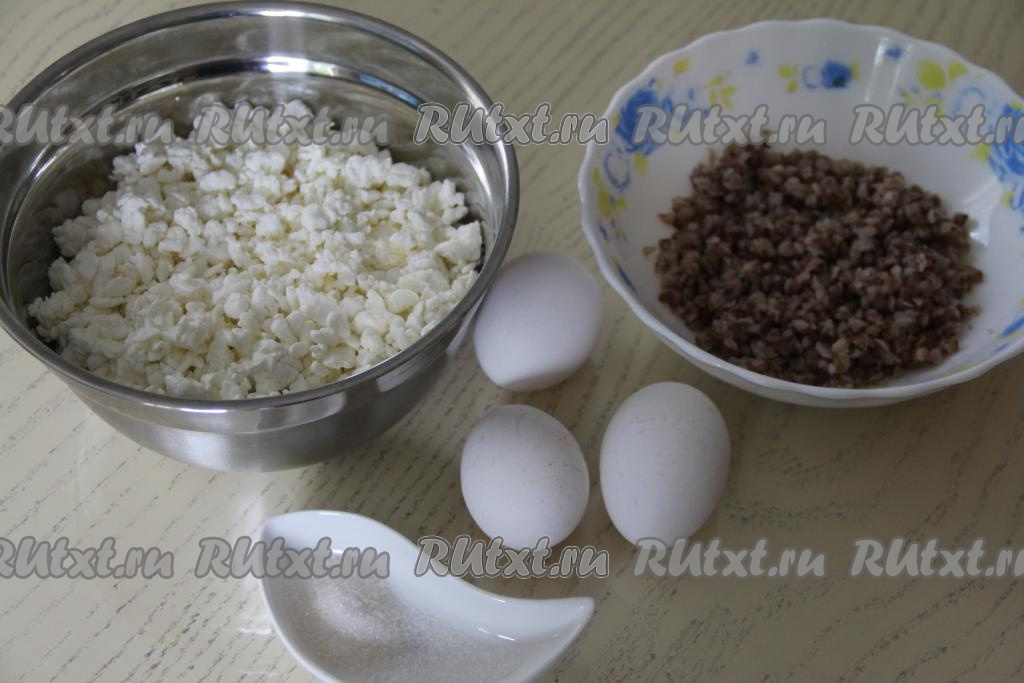 Подготовить продукты. Я взяла творог жирностью 5%. Гречку перебрать, убирая некачественные зёрнышки, промыть водой. В кастрюле вскипятить 200 миллилитров воды, выложить подготовленную гречку, перемешать, дать закипеть. Варить на небольшом огне до готовности гречки (обычно гречка становится мягкой минут через 20). Затем откинуть гречку на сито, чтобы убрать лишнюю воду. Дать варёной гречке остыть. Для этого блюда можно взять и 150 грамм варёной гречки, оставшейся с ужина.