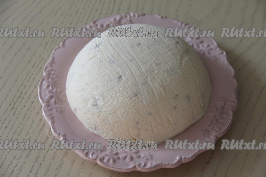 Готовую творожную пасху освободить от верхней марли, а затем аккуратно перевернуть на тарелку, убрать марлю.