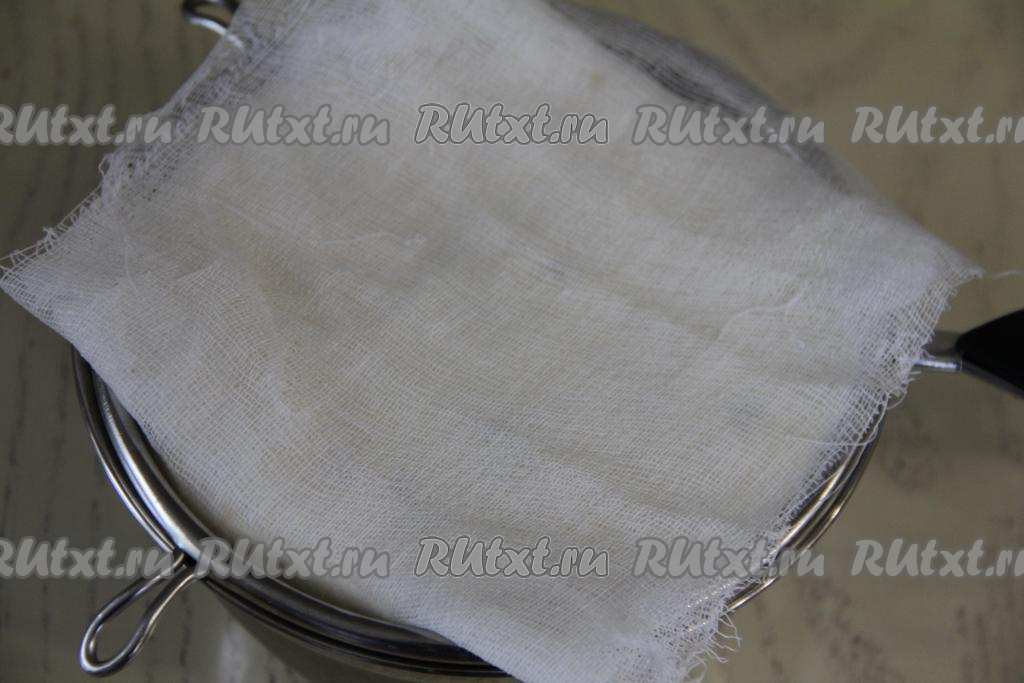 Сито (или пасочницу) выстелить марлей, сложенной в два слоя. Я застелила марлей сито диаметром 14 сантиметров. Края марли должны обязательно свисать с краёв сита (или пасочницы). Выложить в застеленную форму творожную массу, разровнять.