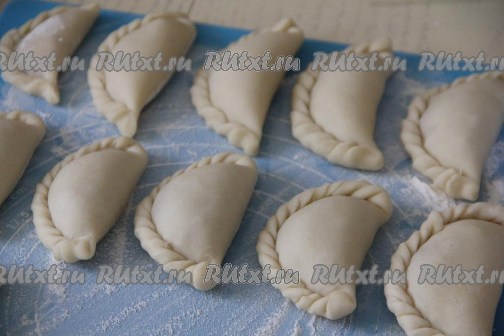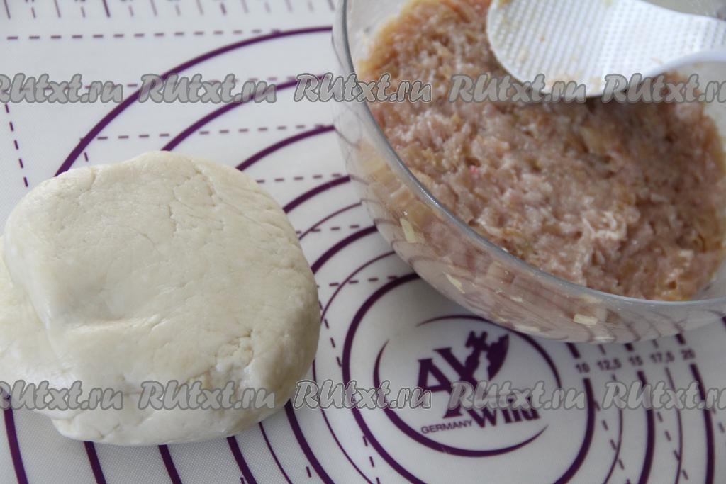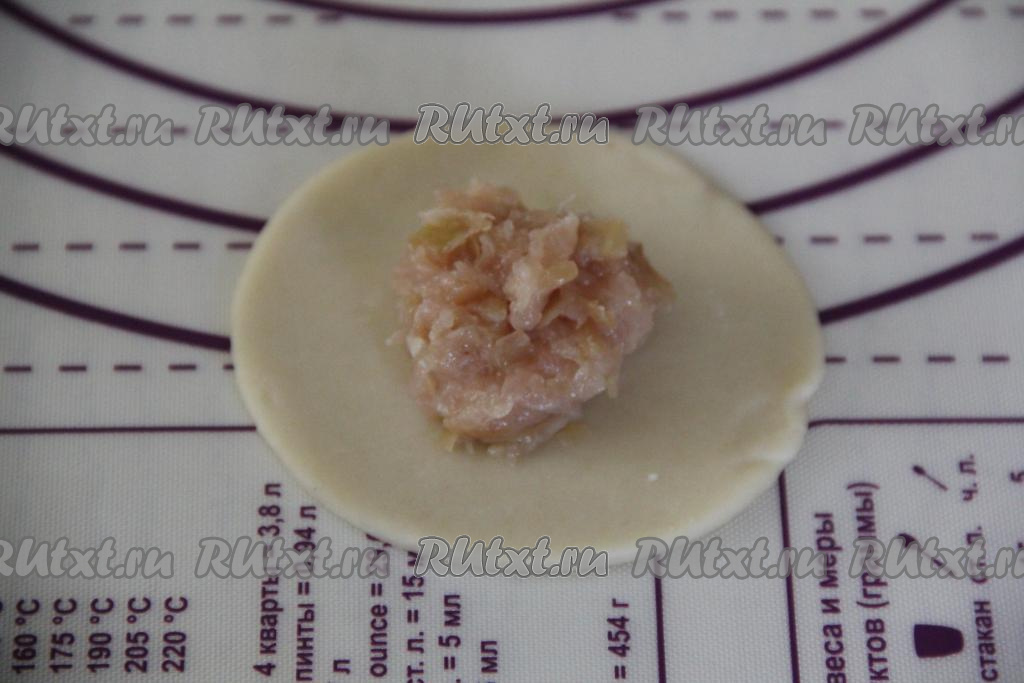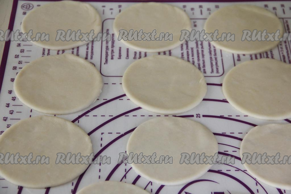 На поверхности, присыпанной мукой, раскатать тесто в тонкий пласт, как на пельмени. Из раскатанного теста вырезать кружочки диаметром примерно 10 сантиметров.