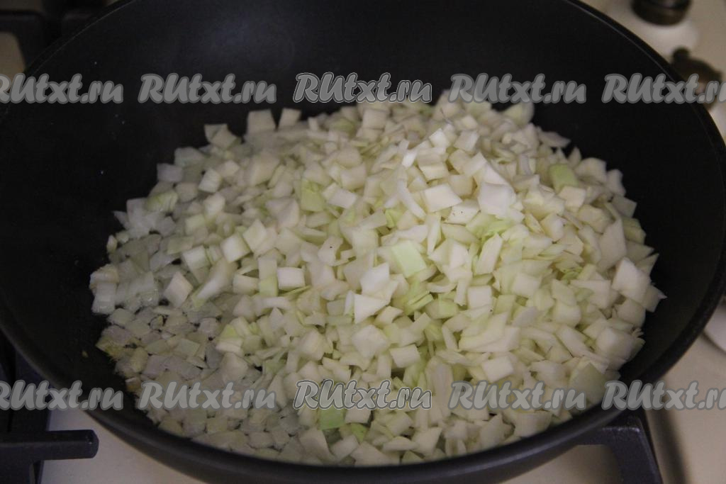 Капусту мелко нарезать, добавить в сковороду с обжаренным луком, перемешать.