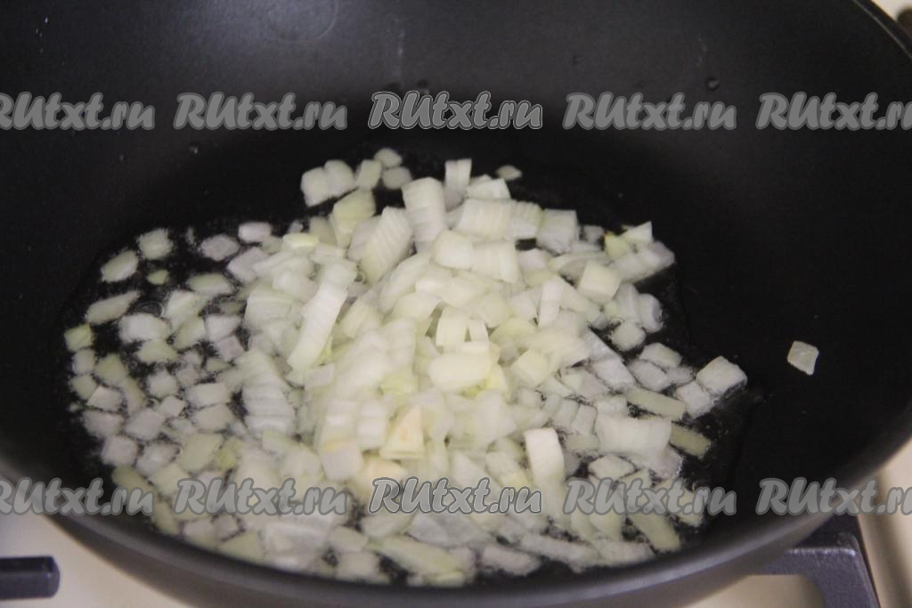 Пока тесто отдыхает, подготовим начинку для колдунов. Для этого очищенный лук нужно мелко нарезать, переложить на сковороду, в которой уже хорошо прогрелось растительное масло. Обжарить лук на среднем огне до прозрачности (на это потребуется 3-4 минуты), периодически помешивая.
