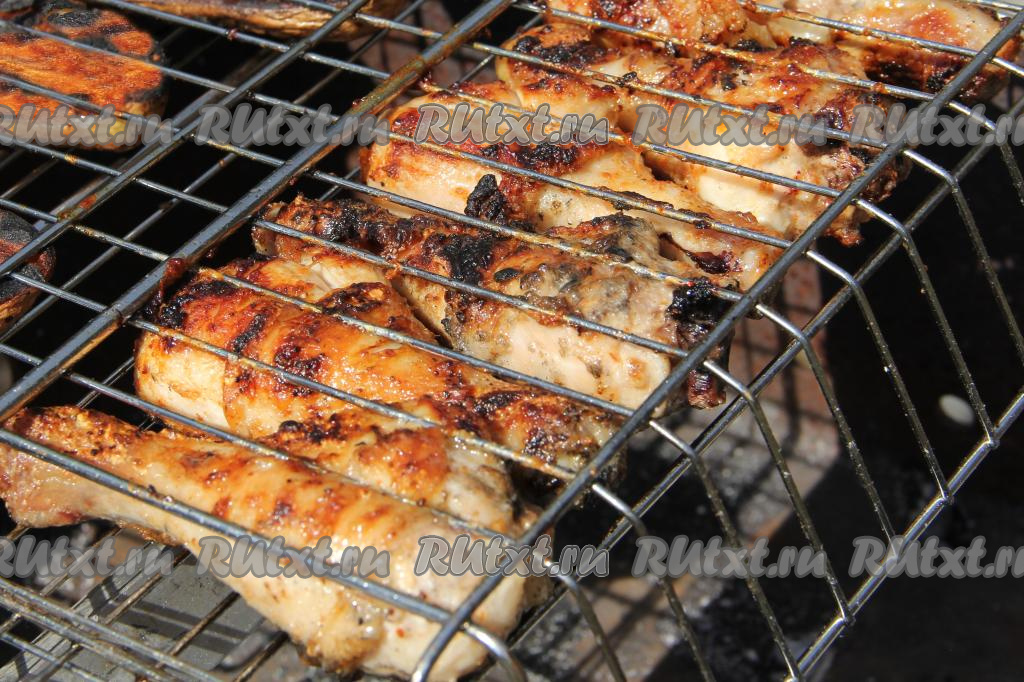 Жарить голени на мангале на седых углях без прямого огня. Во время жарки решётку с куриными ножками нужно достаточно часто переворачивать, чтобы мясо равномерно приготовилось. Мы жарили примерно 20 минут, но время приготовления целиком зависит от жара мангала.