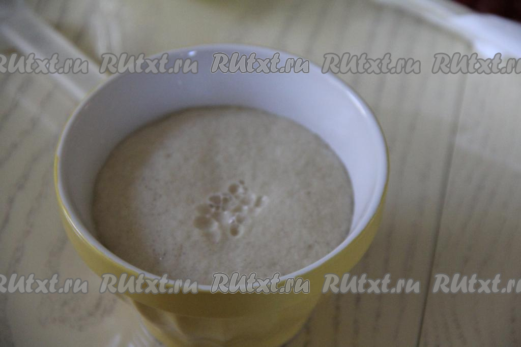 По прошествии 15 минут на поверхности опары должна появиться пышная шапочка, свидетельствующая о том, что дрожжи активировались и нужно приступать к замешиванию теста для кулича.