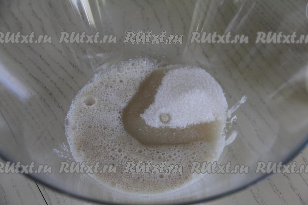 Воду подогреть до 38 градусов, перелить в небольшую ёмкость, всыпать дрожжи вместе с 1 чайной ложкой сахара (сахар взять от общего количества, указанного в ингредиентах), тщательно перемешать получившуюся опару и оставить её в тёплом месте минут на 15.