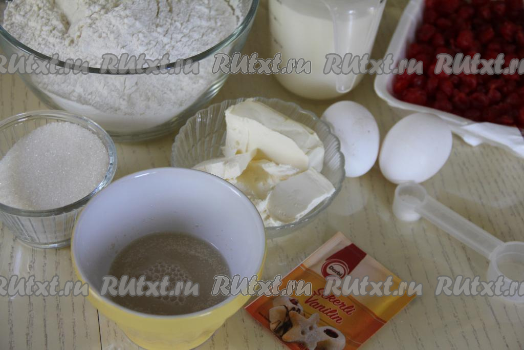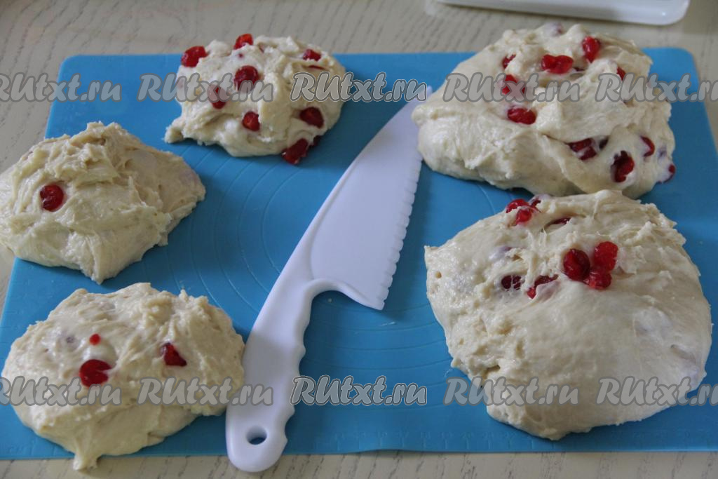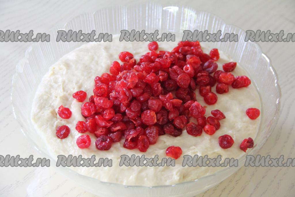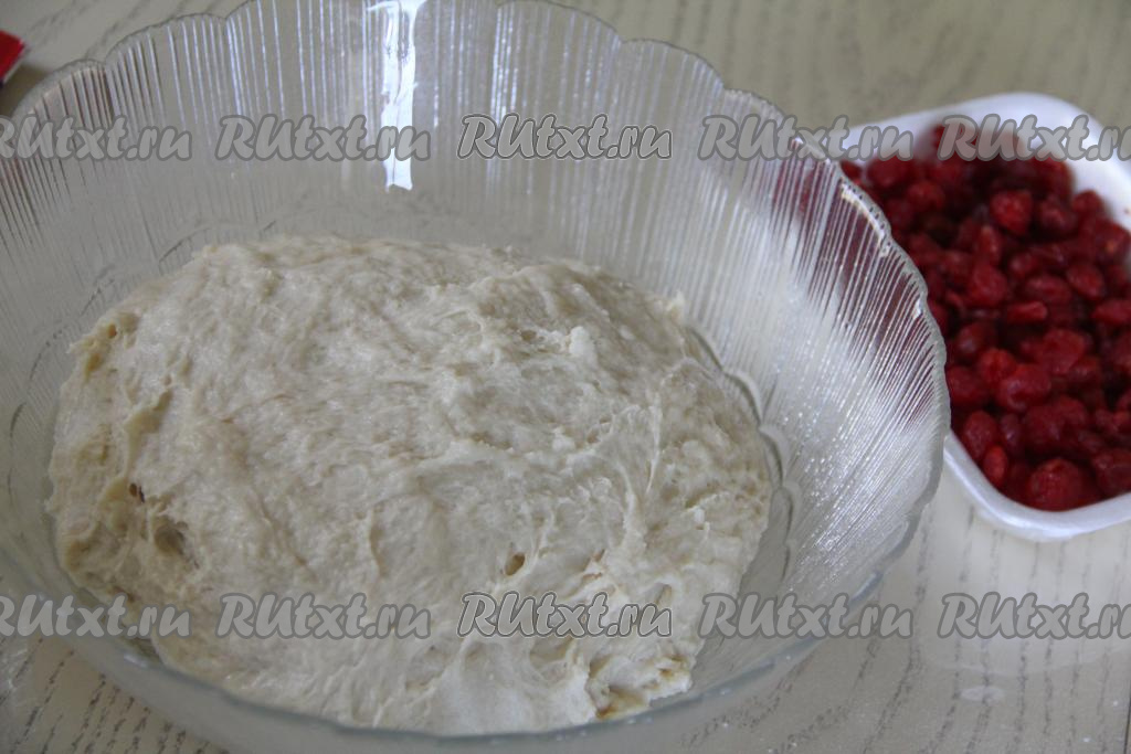 По прошествии 1,5 часов тесто округлится и хорошо увеличится в объёме. Добавить в тесто вяленую вишню.