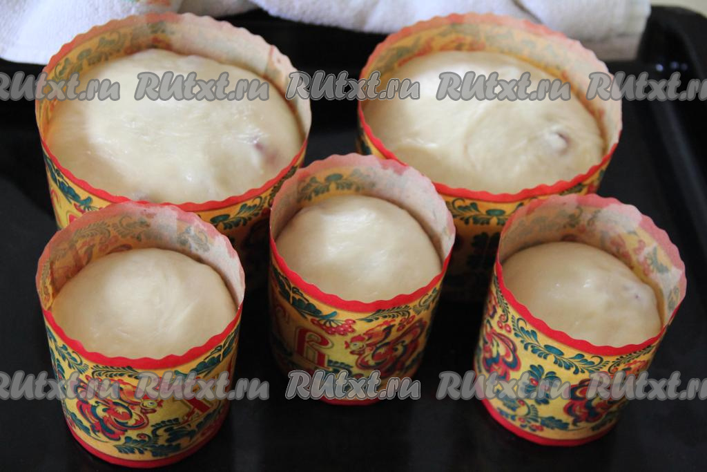 Выложить тесто в формы (я выкладывала в бумажные формы), заполняя их тестом примерно на половину объёма. Я использовала 2 формы диаметром 11 сантиметров и 3 формы диаметром 7 сантиметров. Прикрыть формы с тестом полотенцем и оставить при комнатной температуре на 1 час (тесто должно округлиться и заполнить формы до 2/3 объёма).
