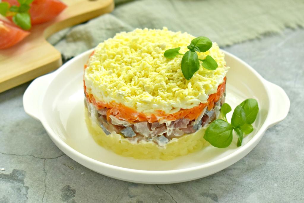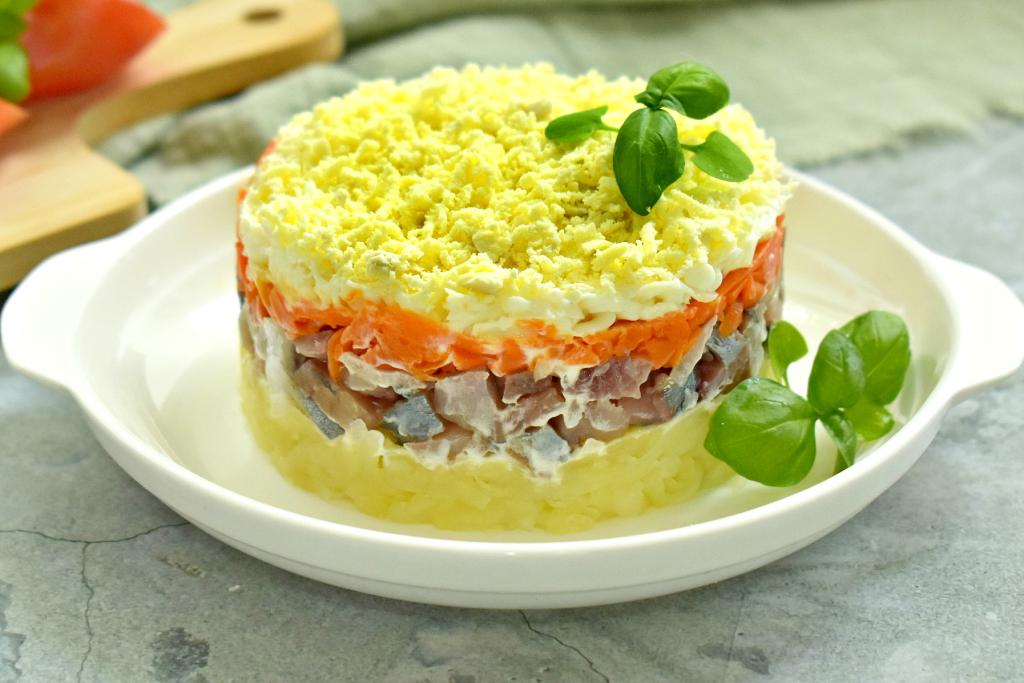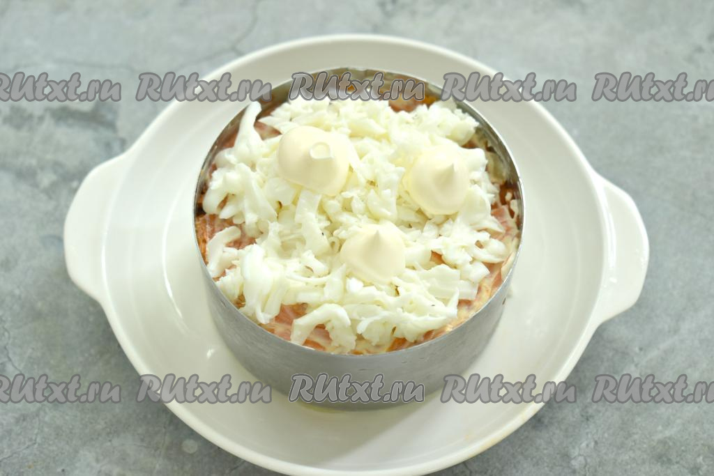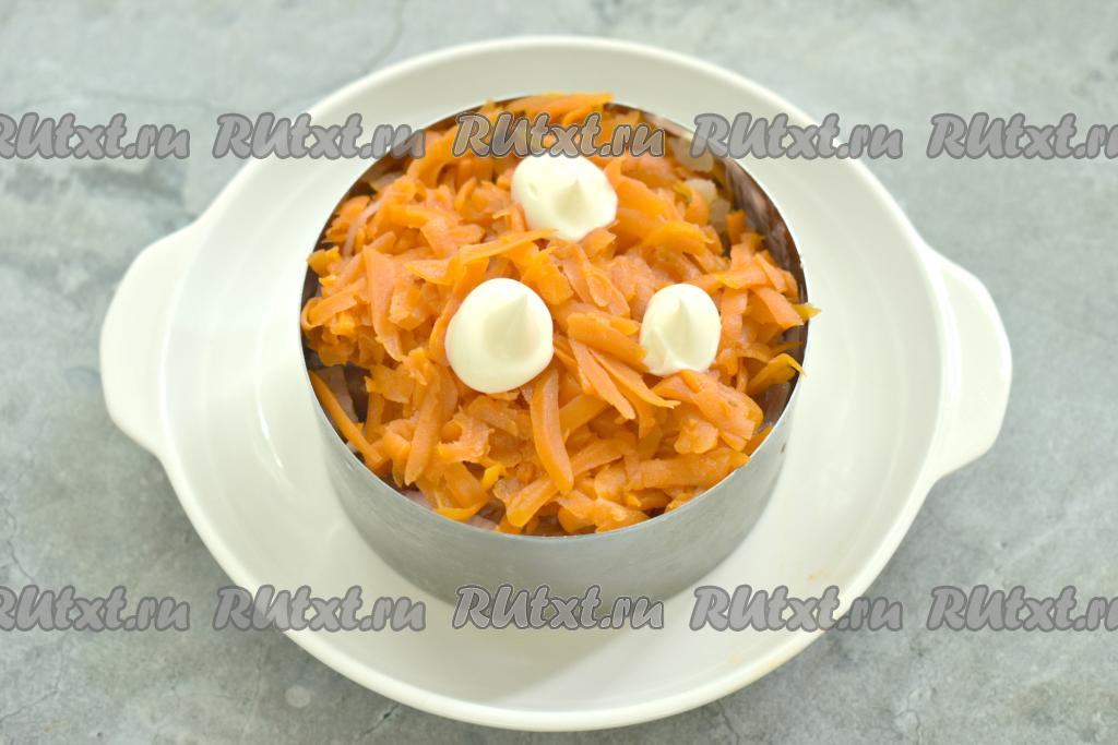 Третьим слоем равномерно выложить очищенную и натёртую на крупной тёрке варёную морковку, смазать майонезом.