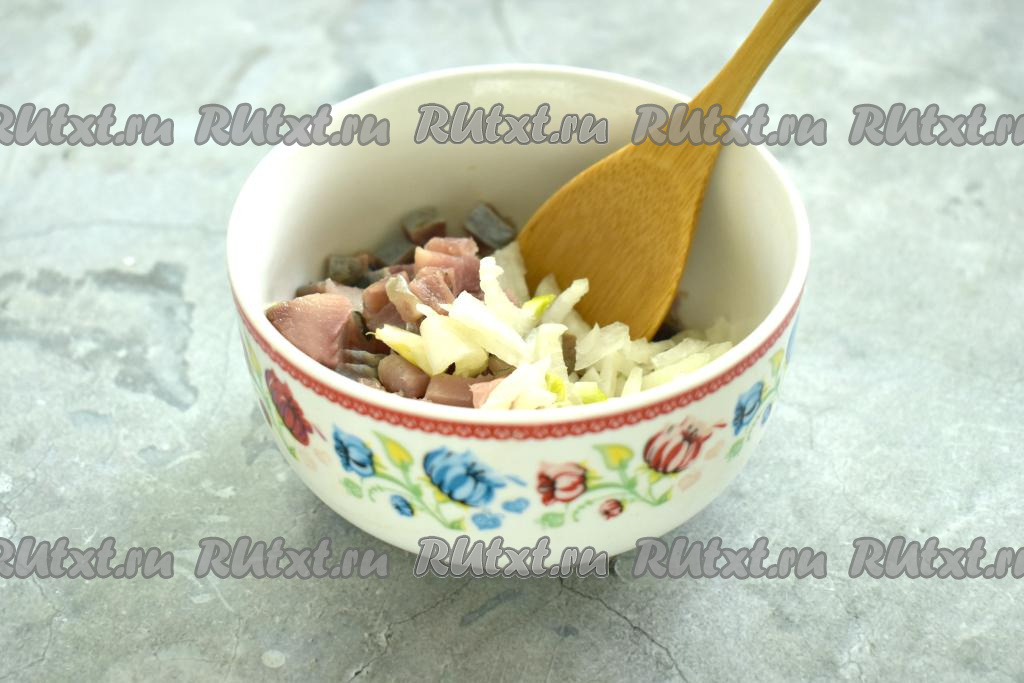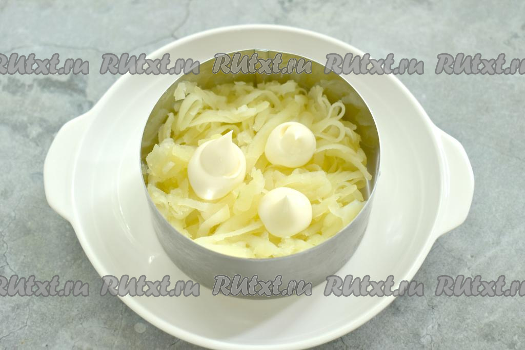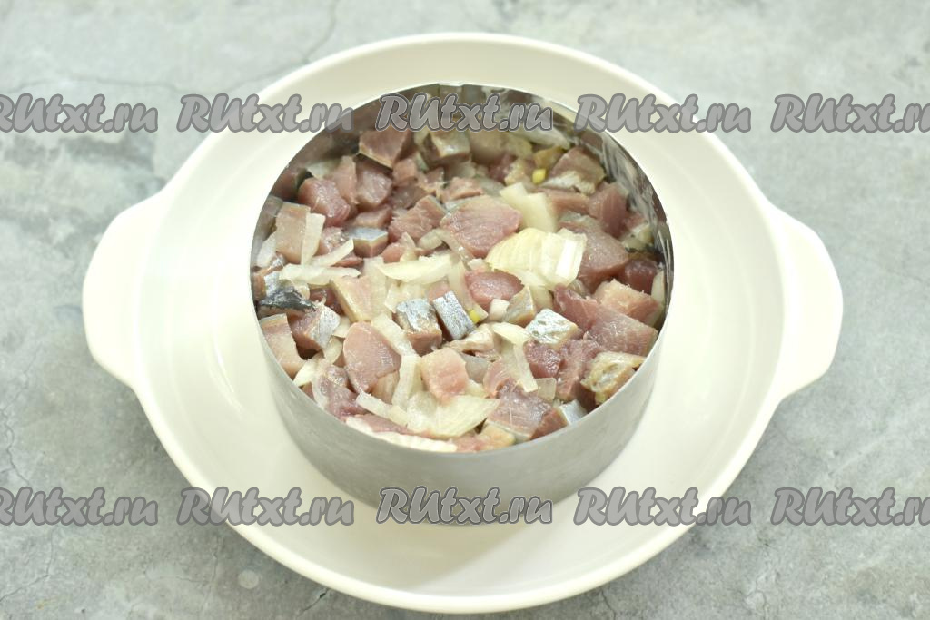 Поверх картошки, смазанной майонезом, выложить селёдку, смешанную с луком. Этот слой салата смазывать майонезом не нужно.