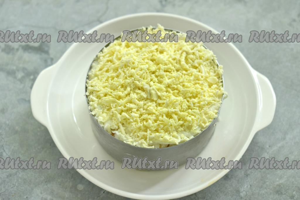 Завершающим слоем салата "Мимоза" по традиции будет желток, натёртый на мелкой тёрке. Этот слой смазывать майонезом не нужно.