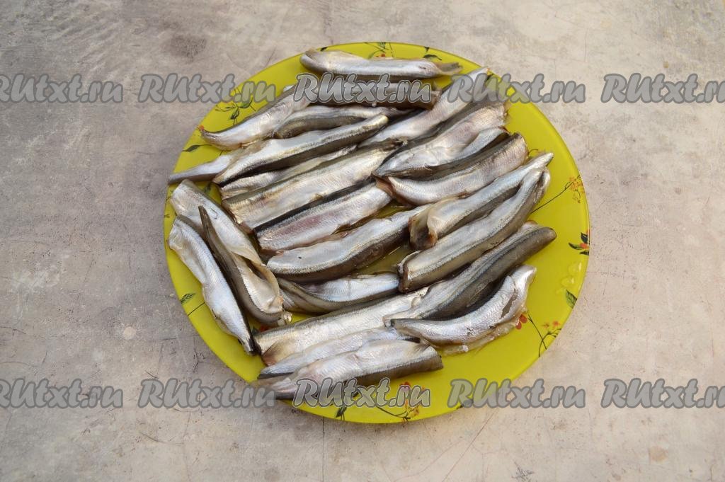 Подготовленную мойву посолить и поперчить по вкусу. Можете добавить свои любимые специи для рыбы.