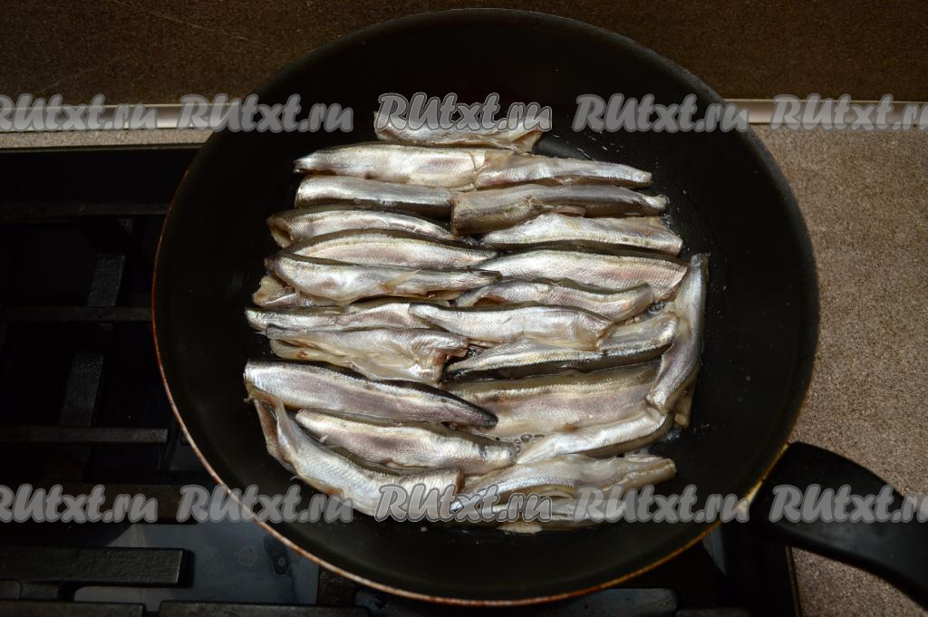 На сковороду влить немного растительного масла, распределить его по всему дну. Разогреть масло, затем выложить подготовленную мойву на сковороду в один слой.