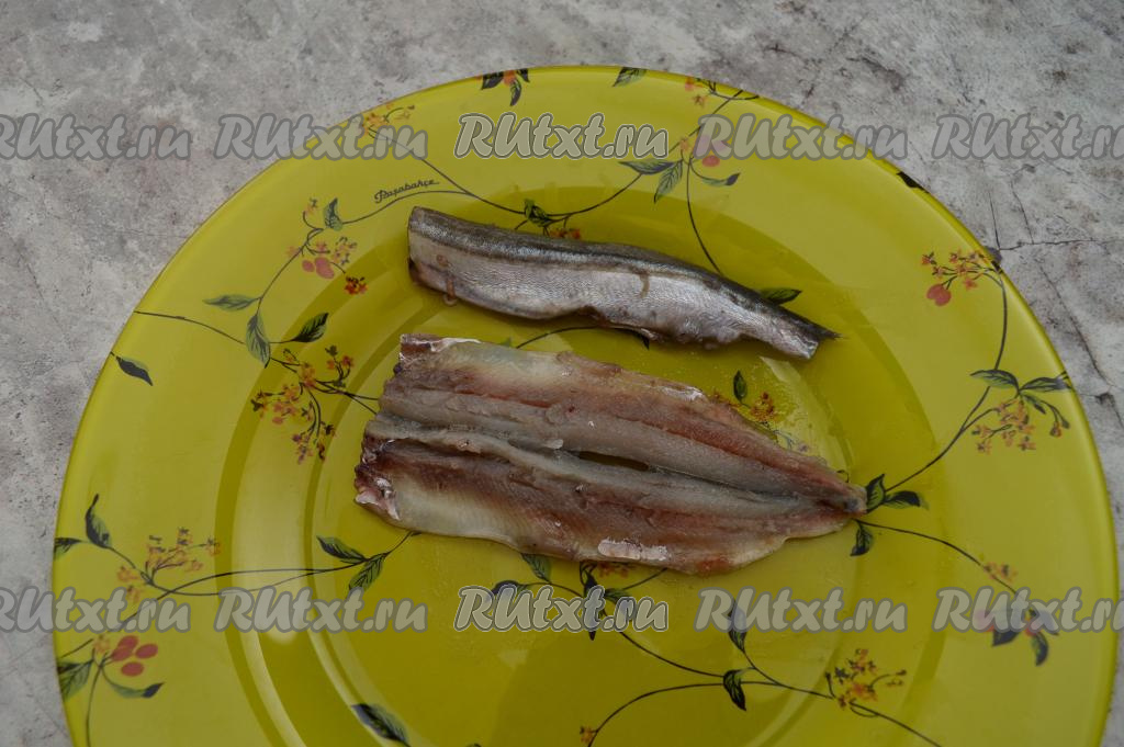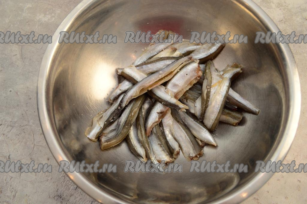 Я каждую рыбку разделываю так. Удаляю голову, вычищаю внутренности, особенно тщательно снимаю чёрную плёнку внутри брюшка, так как она горчит. Срезаю плавники и вынимаю хребет. Получается вот такое филе мойвы.