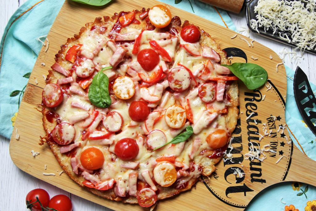 Выложить на овсяноблин начинку для пиццы: нарезанную колбасу, лук, перец и помидоры.