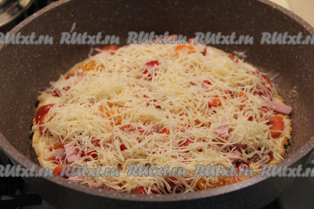 Сверху присыпать пиццу натёртым сыром.