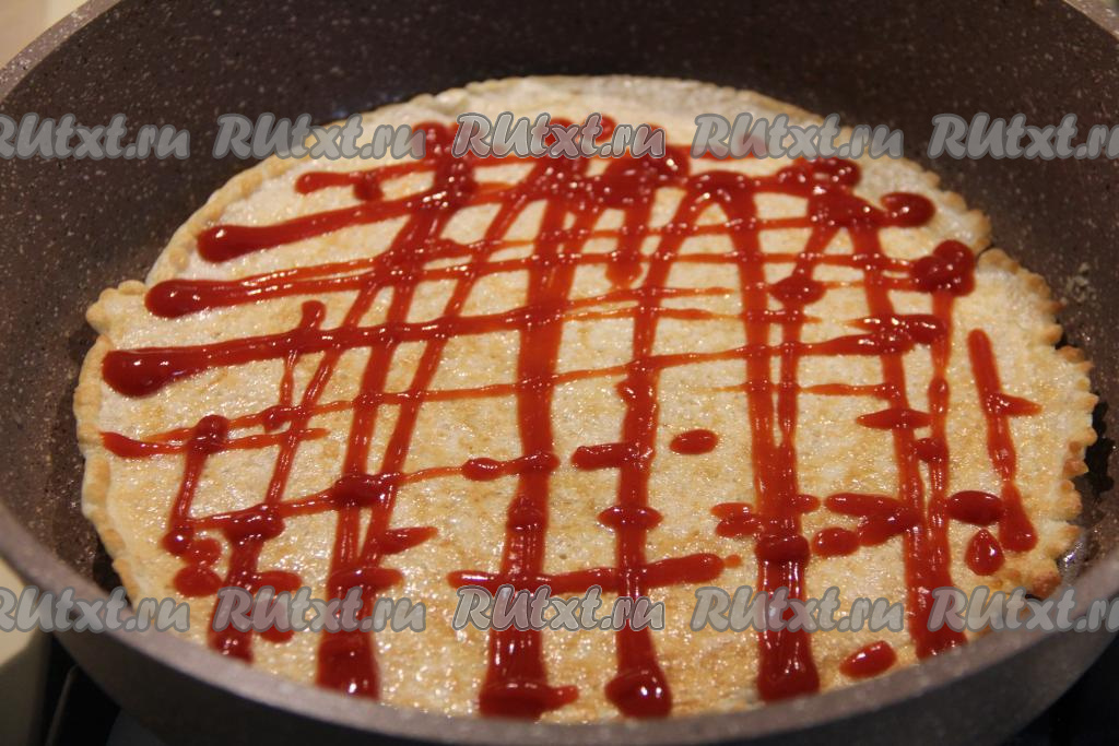 Сразу нанести на овсяноблин сетку из кетчупа (или томатного соуса).