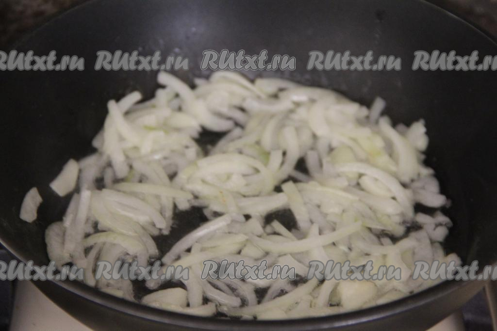 В сковороду влить растительное масло, разогреть, выложить лук, нарезанный на тонкие полукольца, и обжаривать его до прозрачности (минуты 3), иногда помешивая, на среднем огне.