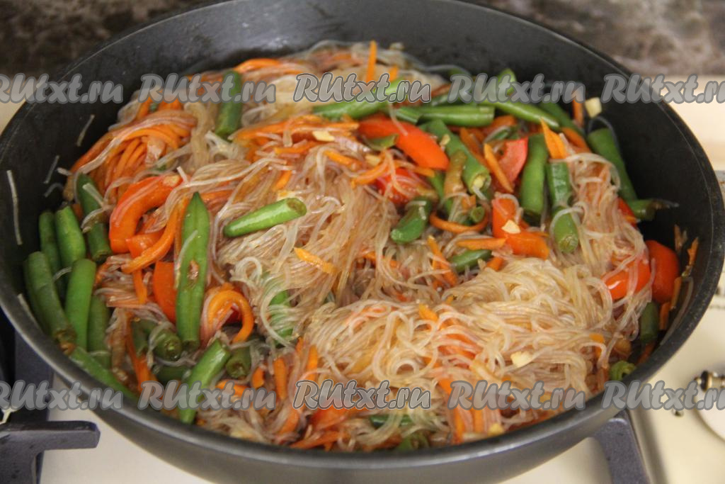 Перемешать, прогреть фунчозу с овощами 2-3 минуты на среднем огне, иногда помешивая. Попробовать на соль, если нужно, подсолить.