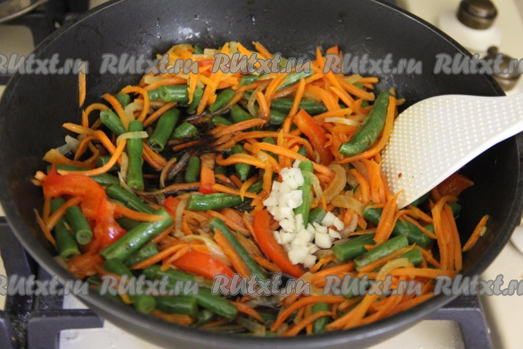 Далее добавить стручковую фасоль, перемешать и жарить овощи, не забывая периодически перемешивать, 5 минут. Овощи должны полностью приготовиться.