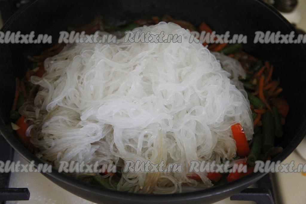 Потомить овощи на небольшом огне 2-3 минуты, добавить фунчозу.