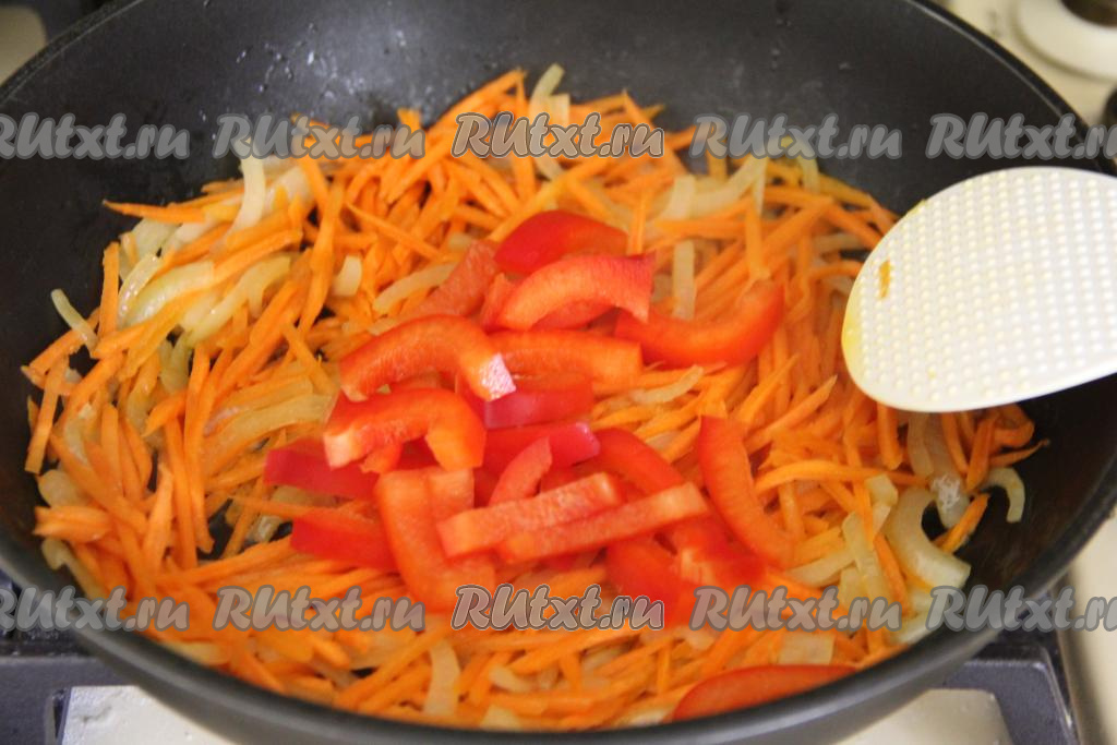 К обжаренному луку добавить морковку, натёртую на крупной тёрке (или на тёрке для корейской моркови), перемешать, обжаривать овощи минут 5 (морковка должна стать достаточно мягкой), иногда помешивая. Затем к овощам выложить болгарский перец, нарезанный на полоски, перемешать, обжаривать овощи, время от времени помешивая, ещё минут 5.