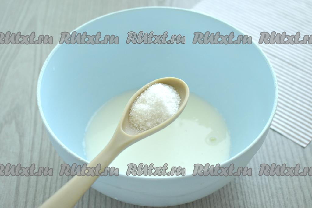 Тёплый кефир переливаем в миску, всыпаем сахар и соль, перемешиваем.