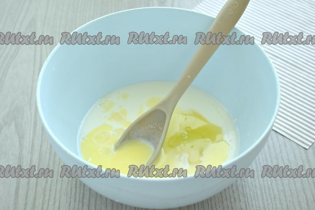 Далее в кефир добавляем растопленное сливочное масло, вбиваем яйцо.