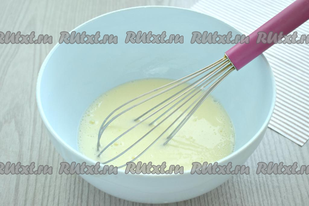 Смесь кефира, яиц и масла перемешиваем венчиком до однородности.