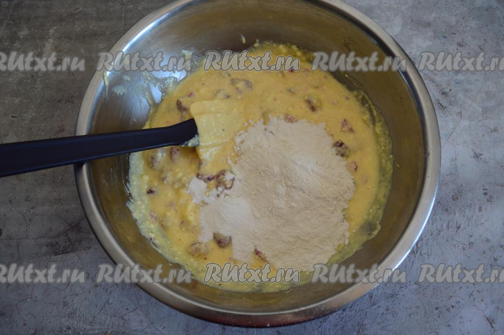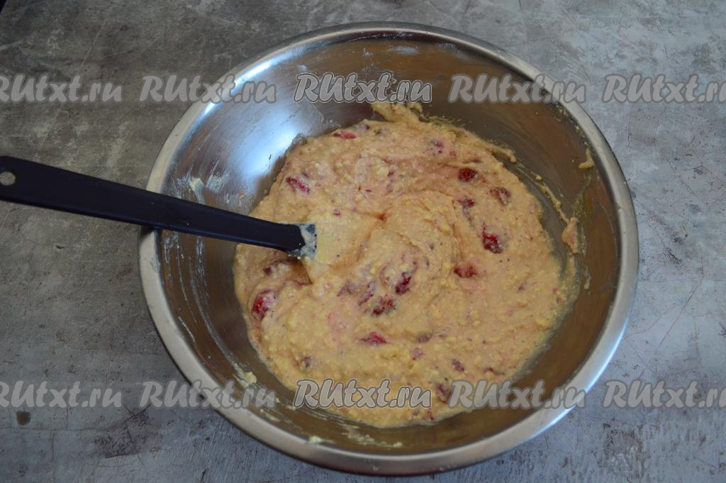 Вмешать ягоды в тесто лопаткой. Всыпать разрыхлитель и примерно половину муки.