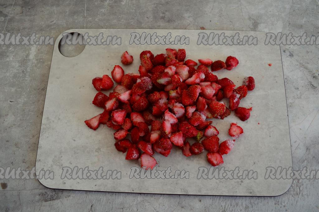 Если на замороженной клубнике нет большого количества льда, значит размораживать ягоды не нужно. Замороженные ягоды клубники нарезать на небольшие кусочки.
