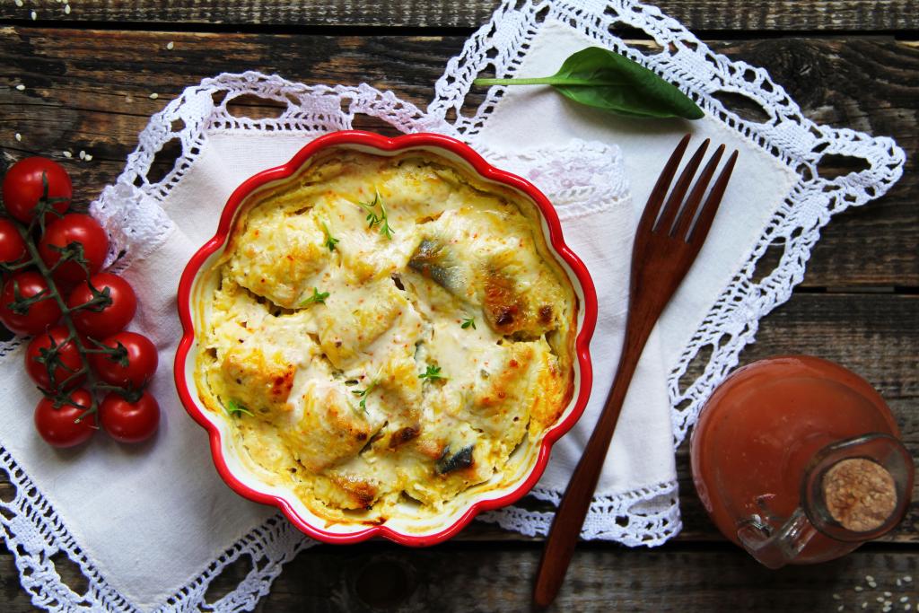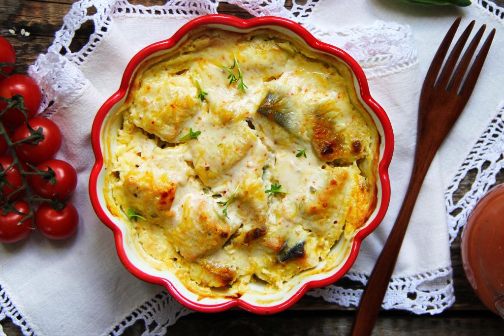 Достать готовое рыбное блюдо из духовки. Благодаря тому, что филе горбуши запекалось в сметане с сыром, рыба получилась нежной, сочной и вкусной, к столу подаём в горячем виде, дополнив гарниром (например, рисом или картофельным пюре).