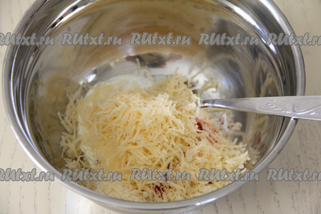 В миске соединить сметану, воду и натёртый на мелкой тёрке сыр, добавить соль и специи, перемешать получившийся смеманно-сырный соус.