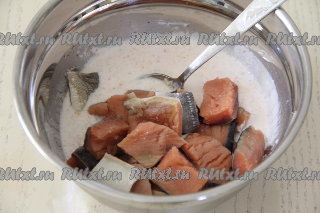 Выложить кусочки рыбы в сметанно-сырный соус и перемешать.
